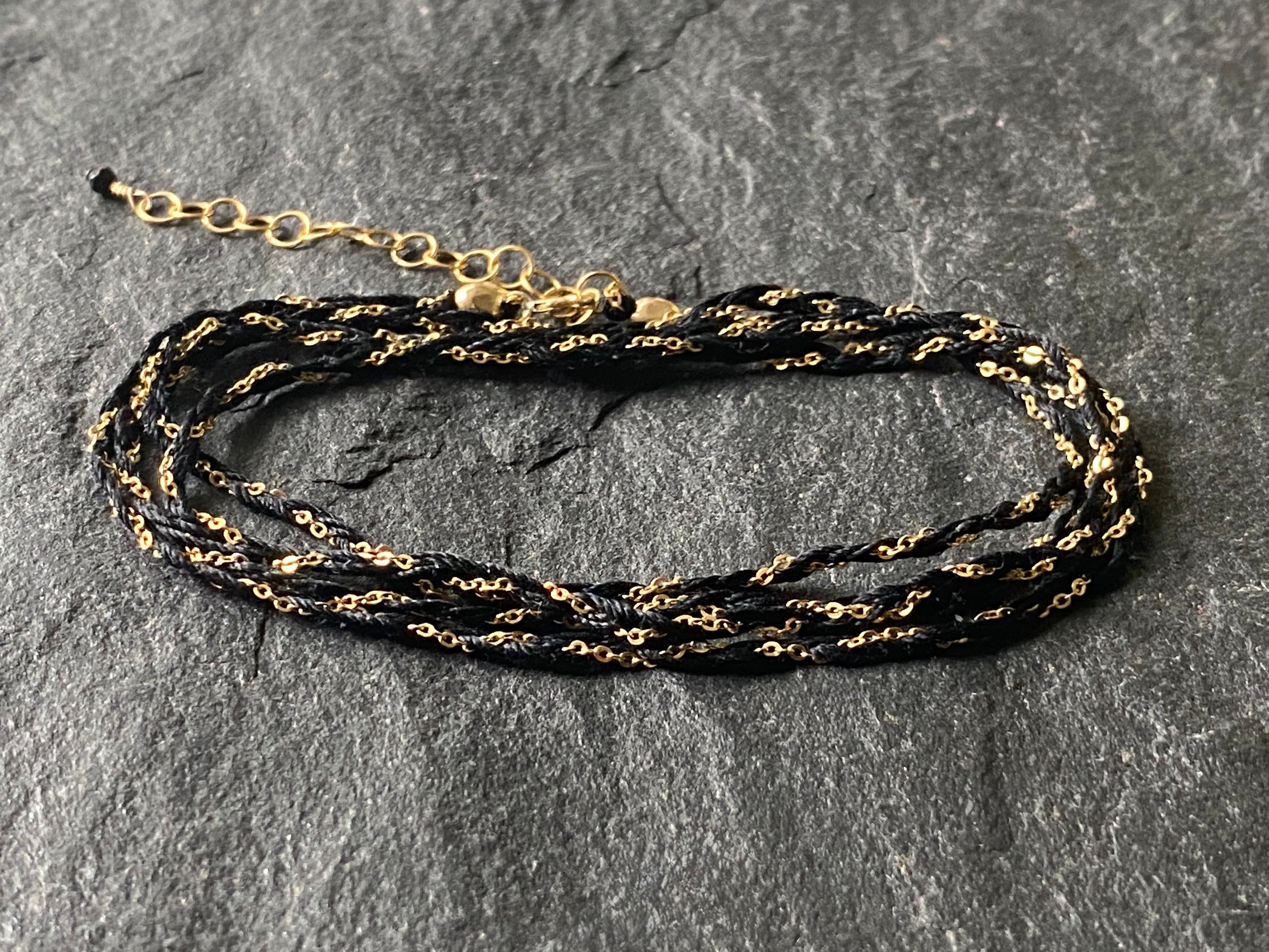 The Silk Wrap with Gold-Filled Chain is a versatile piece designed for effortless elegance and creativity. It can be worn as a necklace, bracelet, or anklet — depending on your style...